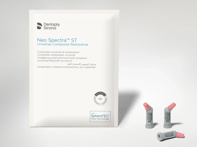 Композиты Neo Spectra ST - это семейство новых композитных материалов Neo Spectra ST (LV и HV) и Neo Spectra ST Effects с запатентованной технологией наполнителя SphereTEC Наполнитель SphereTEC - это сферические гранулы, состоящие из субмикронных частиц бариевого стекла в сочетании с оптимизированной полимерной матрицей, которые выводят характеристики композита на новый уровень: все композитные материалы линейки Neo Spectra ST демонстрируют не имеющие аналогов манипуляционные свойства, возможность быстрой и простой полировки, а также выраженный блеск, позволяя создавать композитные реставрации с естественной эстетикой Neo Spectra ST - это нанокерамический, светоотверждаемый, рентгеноконтрастный универсальный композит, предназначенный как для прямых реставраций во фронтальном и боковом участке, так и для непрямых , изготовления вкладок, полукоронок и виниров Композит Neo Spectra ST доступен в 2 вариантах вязкости - LV (низкой) и HV (высокой), для выбора во время моделирования реставрации, и обладают одинаковыми свойствами: не липнут к инструменту, отлично адаптируются к поверхности тканей зуба, пластичны и устойчивы к стеканию, т.е. хорошо держат форму, обладают высокой устойчивостью к усадке Neo Spectra ST HV - это универсальный композит высокой вязкости, более плотный, пакуемый, чем материал LV (низкая вязкости) Neo Spectra ST HV и LV состоит из 5 универсальных оттенков CLOUD shades (А1, А2, А3, А3,5, А4), которые перекрывают всю шкалу оттенков VITA благодаря выраженному эффекту хамелеона и уникальным оптическим характеристикам Показания к применению: прямые реставрации полостей всех классов передних и боковых зубов для непрямого изготовления вкладок, накладок и виниров Комплектация: 24 компьюлы (4 x A1, 4 x A2, 8 x A3, 4 x A3.5, 4 x A4) x 0.25 г пистолет Prime &Bond Universal x 2.5 мл аппликаторов 50 шт Clix-dish 1 шт